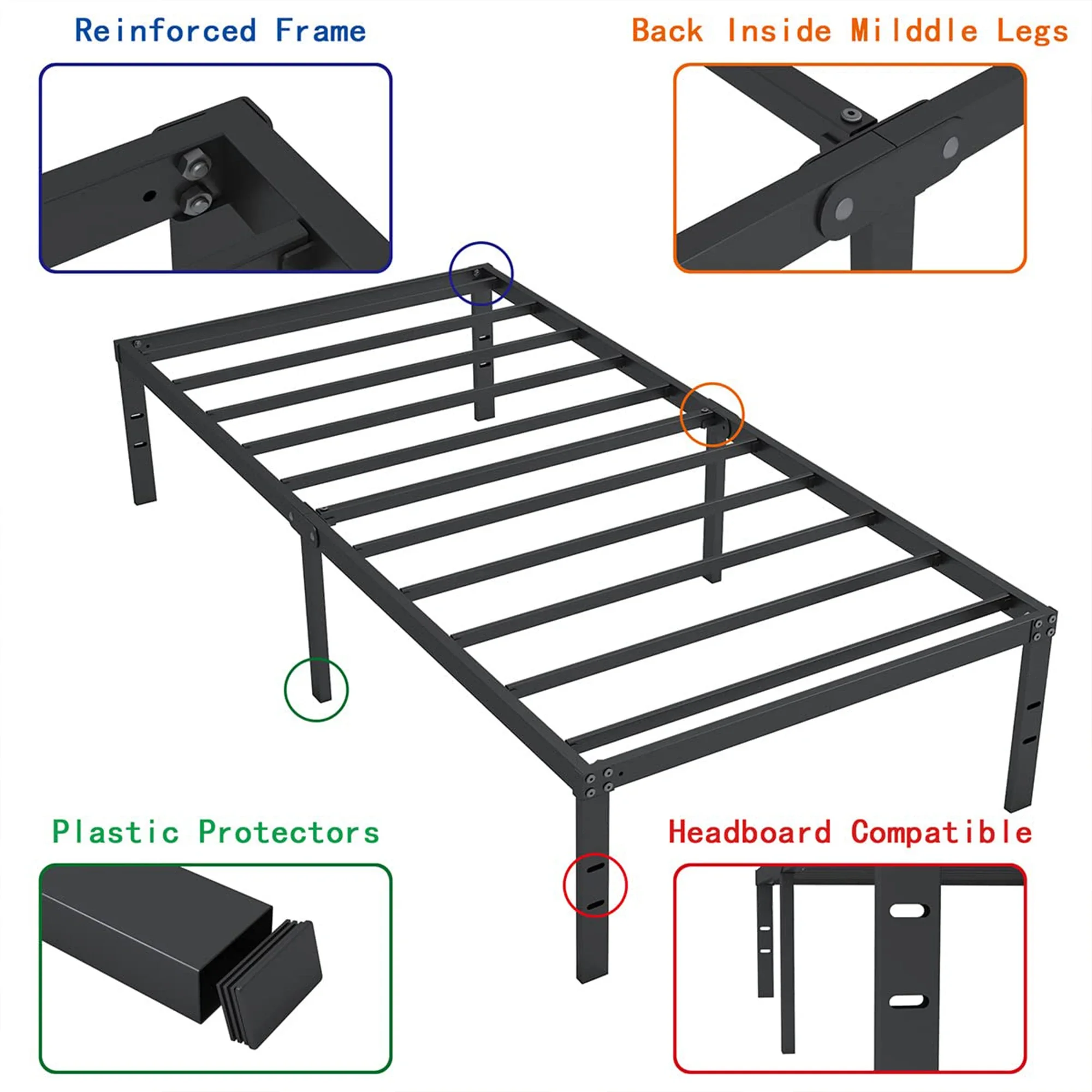 Enjoy a supportive and restful sleep on our 14-inch metal bed frame. Its sturdy steel construction ensures durability and quiet nights, while the no-box-spring design simplifies setup and saves you money